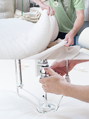 On closer examination, this production concept has also been normal in Europe for centuries, however, not for the common, mostly cheap everyday goods. High-quality mattresses from companies like Schramm, Treca, Vispring, Hästens, etc. have been manually fabricated for generations and stitched by hand from upholsterers. But back to the futon. High-quality, modern, futons, like the ones from Futonwerk are as well manually hand-made. Raw materials like Pure new wool, Horsehair, Coconut fiber, Hemp or Natural latex are processed in addition to Cotton which has a lower priority in the local futon. The cotton which gladly is portrayed as the main content of the futon, is actually too wispy, too filigree for this purpose and it is unprotected against Bacteria and Mold, which like settle in the moist atmosphere of a mattress. In ancient Japan it was different, there the light futons would be rolled up and put away daily so that the cotton was loosened and dried. Nevertheless, over here almost nobody does that and the cotton will soon be rattled and hard. A little cotton in the futon is good because of its antistatic characteristic and in connection with other fibers and latex, it will stay smooth.