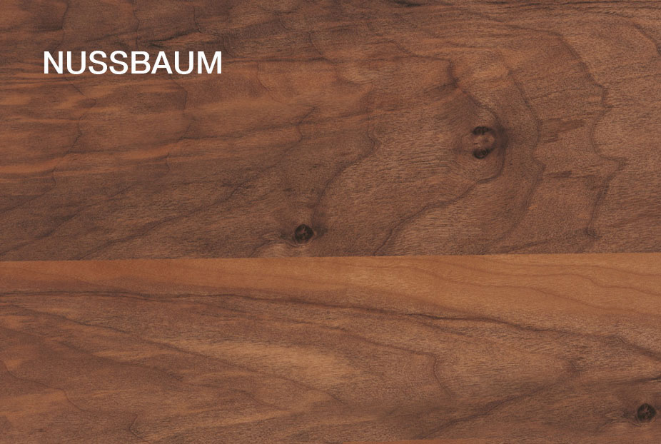 Das deutlich dunkelbraun gefärbte, edle Holz des Nussbaums stammt meist aus Ost- Europa und erfreut sich besonders bei hochwertiger Innenausstattung großer Beliebtheit. Die lebendige Maserung des leicht gräulich glänzenden Splintholzes ist teilweise durchzogen von dunklen Streifen, was ihr eine besonders exklusive Optik verschafft. Um diese zu erhalten, wird das Holz oft unverarbeitet genutzt, was aufgrund seiner Stabilität und Beständigkeit keinerlei Nachteile mit sich bringt.